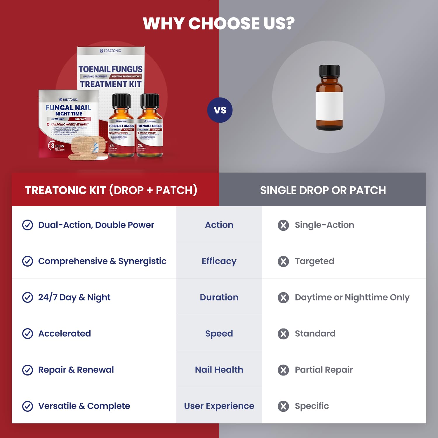 - COMPLETE 2-STEP TOENAIL FUNGUS TREATMENT KIT FOR TOE NAIL & FINGERNAILS: TREATONIC’s 2-step nail fungus treatment kit delivers 24/7 results. Use the extra strength antifungal liquid solution during the day and renew nail fungus patches at night to combat stubborn infections from every angle. This powerful system is ideal for users seeking a visible, fast-acting toenail fungus treatment that fits their lifestyle.